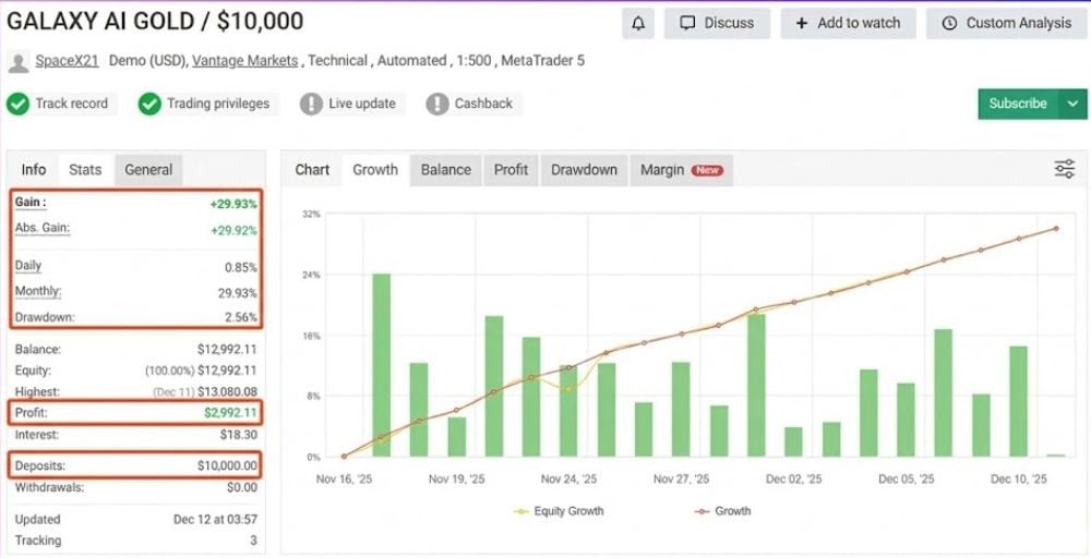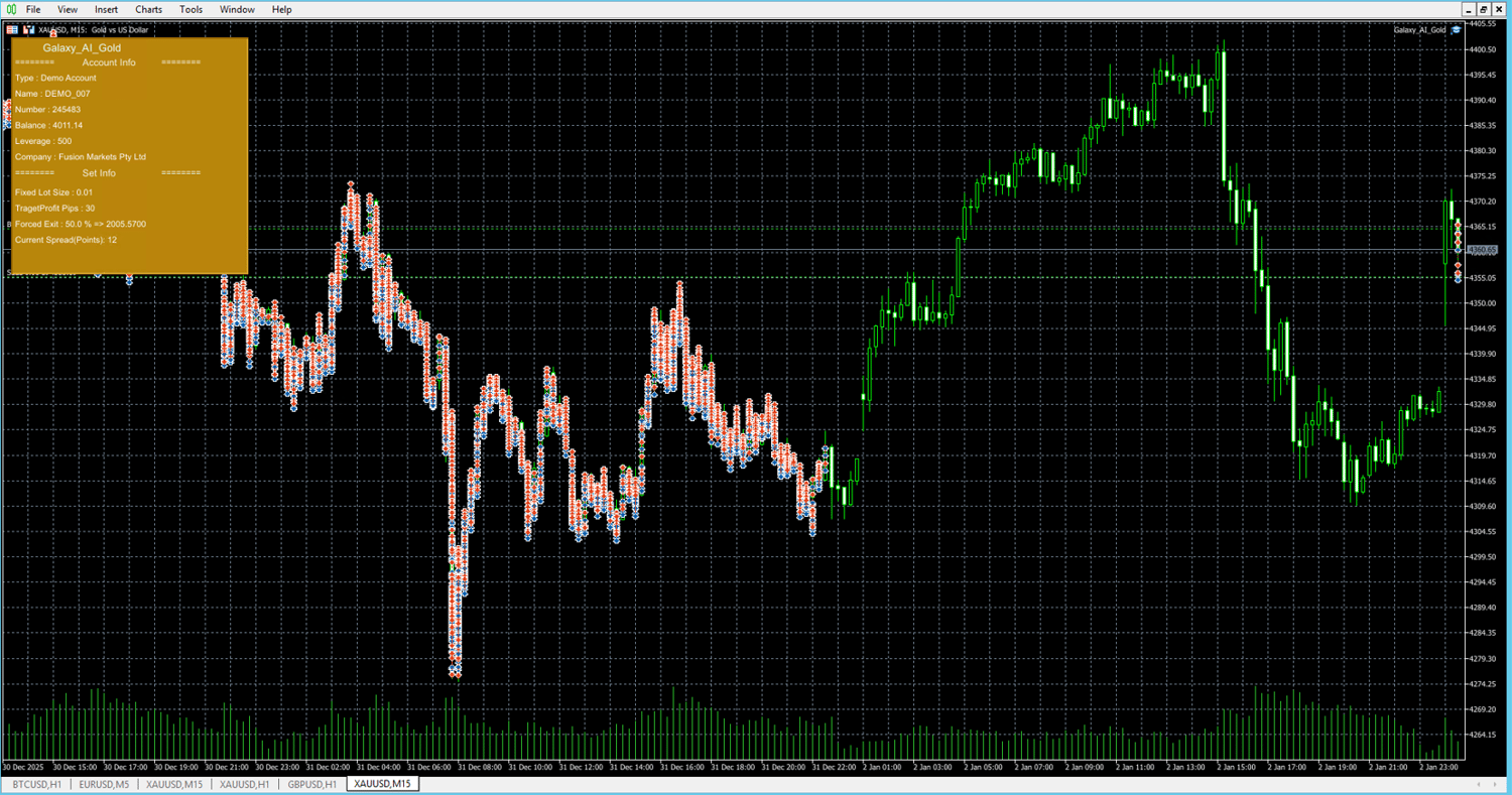 Galaxy AI Gold is a professional Expert advisor (EA) developed specifically for XAUUSD trading on MetaTrader 5. It uses a private lot-sizing algorithm combined with a controlled martingale averaging structure to exploit gold’s intraday volatility. The system focuses on small, frequent profit cycles, basket recovery logic, and strict exposure caps, making it suitable for traders seeking structured gold automation with long-term stability.