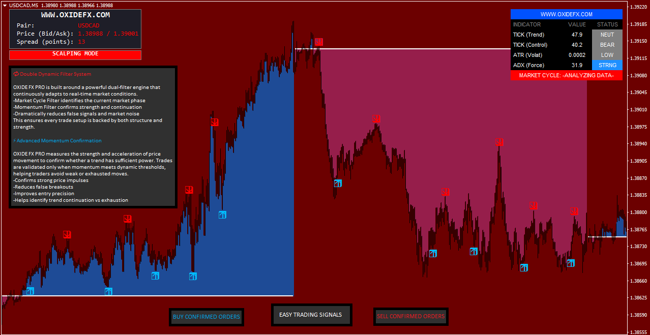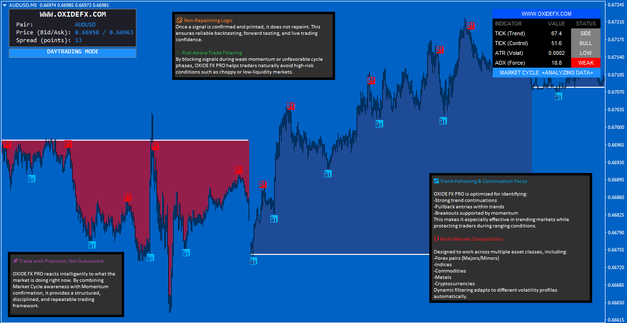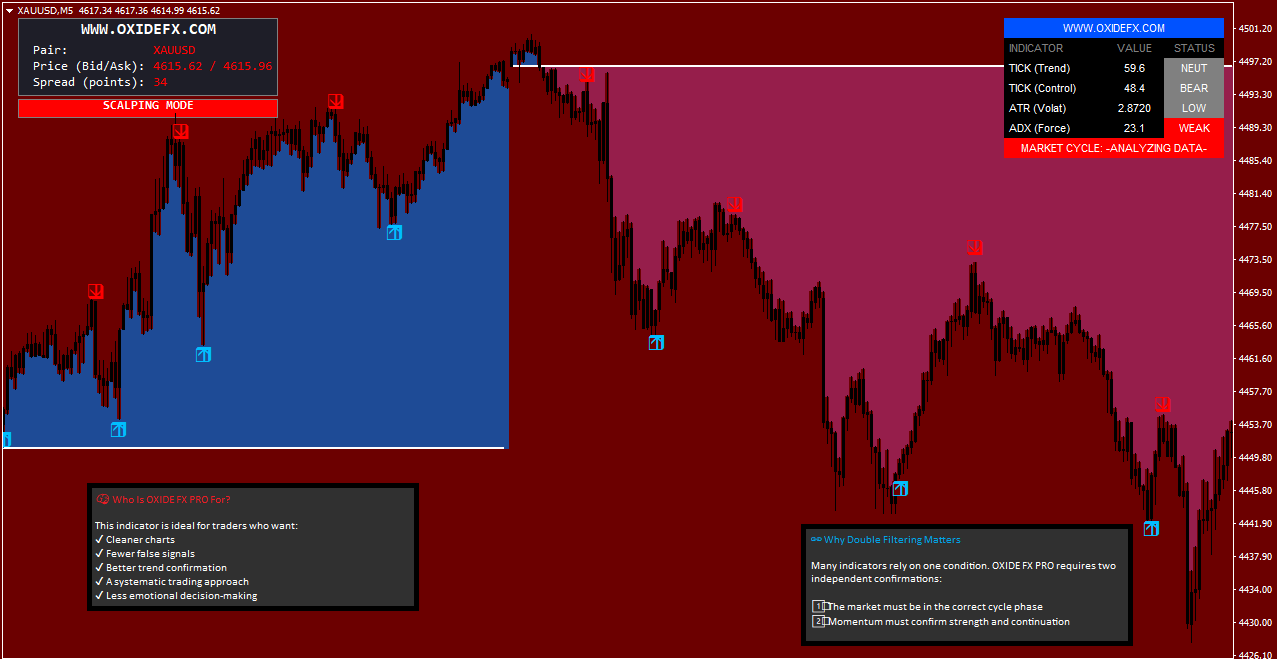 OXIDE FX PRO is a professional MetaTrader 4 (MT4) trading indicator built to help traders identify high-probability buy and sell opportunities with less noise and fewer false signals.