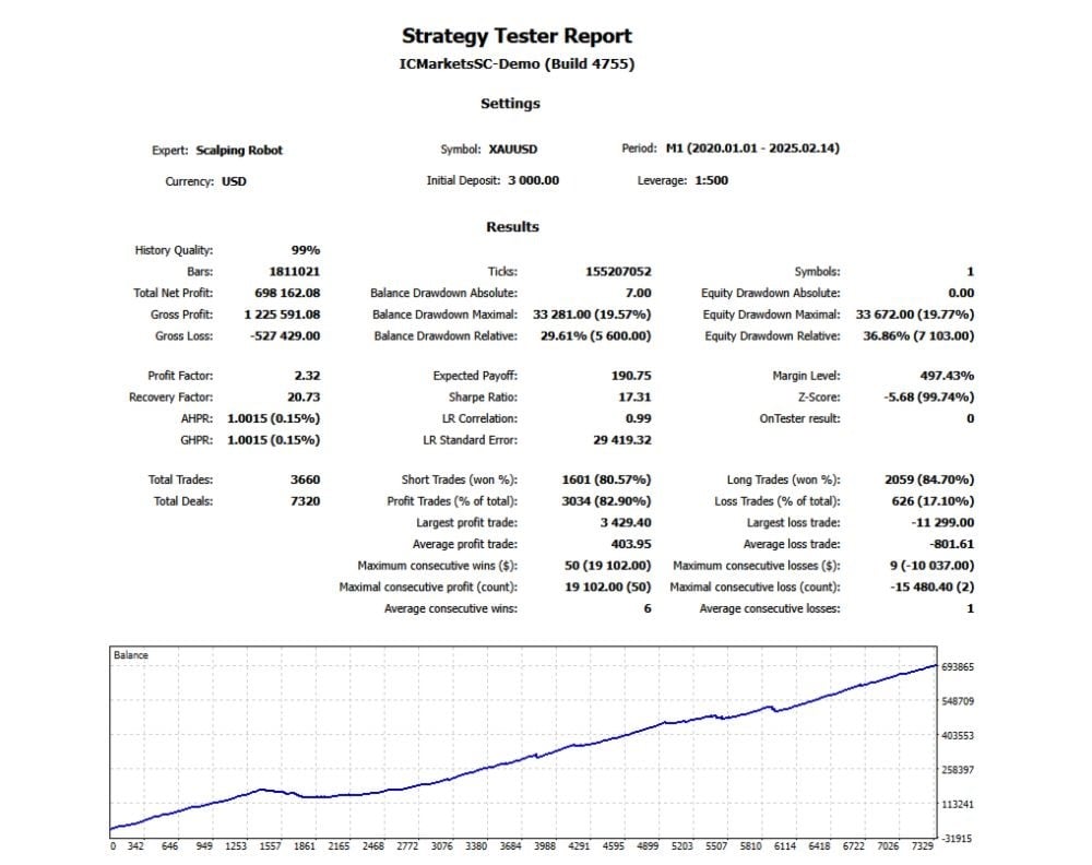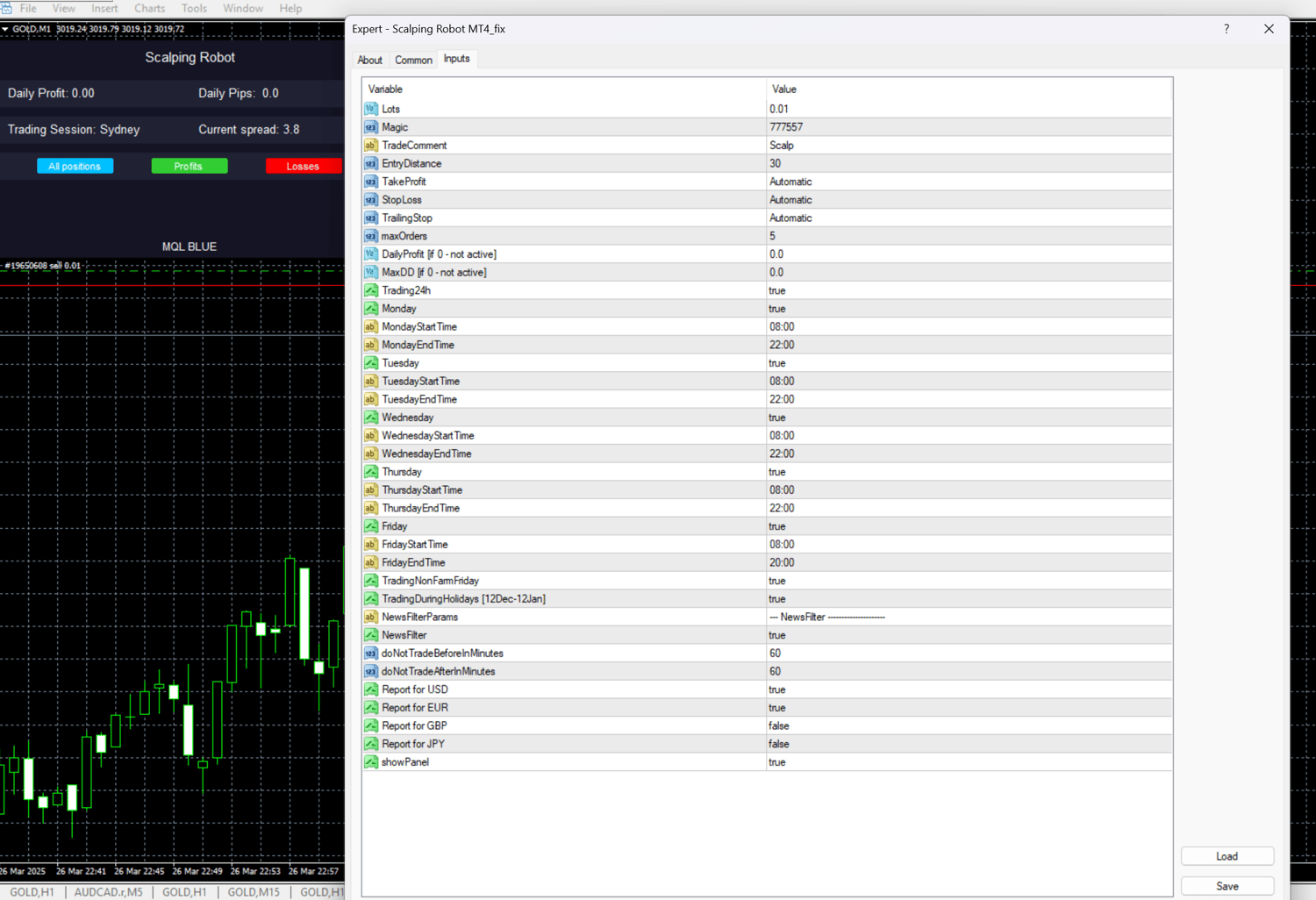 Scalping Robot MT4 is an expert advisor designed with a scalping algorithm to identify high-probability entry and exit points, ensuring optimal trade execution within the M1 timeframe on the MetaTrader 4 platform. The ideal pair for this robot is XAUUSD. The EA opens positions daily from Monday to Friday, with each trade protected by Take Profit and Stop Loss levels, as well as an additional safeguard through a maximum drawdown (max DD%) setting.