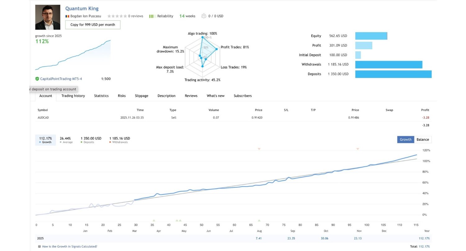 Quantum King EA brings the strength of a structured grid and the intelligence of adaptive Martingale into one seamless system — designed for AUDCAD on M5 and built for both beginners and professionals who want steady, controlled growth.